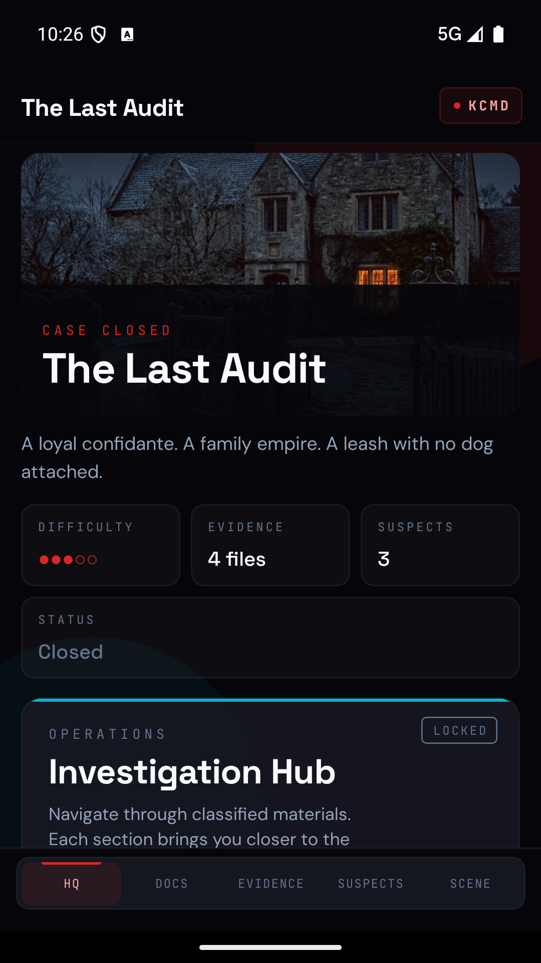 Choose from a growing library of handcrafted mysteries. Each case is rated by difficulty and estimated playtime.